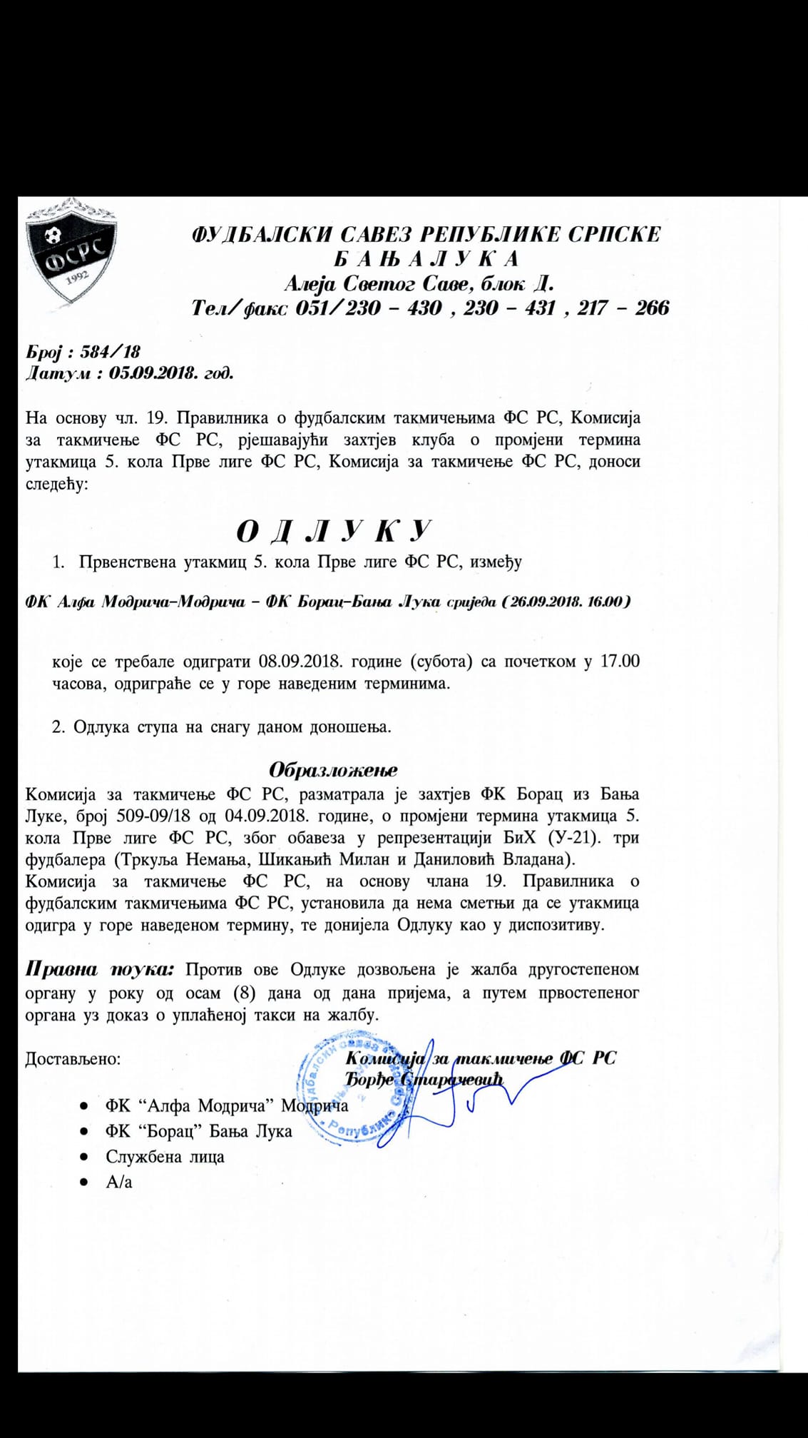 Iako je 5. kolo Prve lige RS tek u najavi, već dosta bure je izazavala jedna utakmica. Ona na stadionu “dr Milan Jelić” u kojoj treba da se sastanu Alfa Modriča i Borac. Umjesto u subotu, na zahtjev banjalučana ovaj duel igraće se 26. septembra, a razlog je što Borac daje tri reprezentativca BiH (Danilović i Trkulja U-21, Šikanjić U-19) i zbog toga ima pravo na odgađanje.