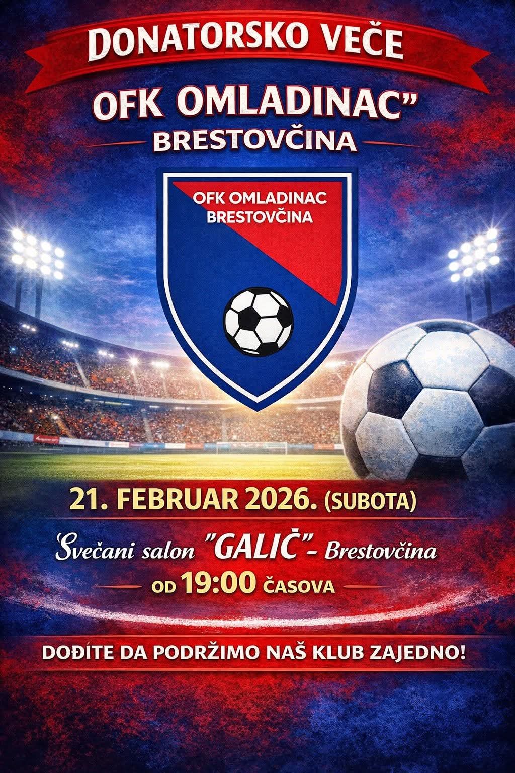 Fudbalski klub Omladinac iz Brestovčine organizuje veliku donatorsku veče, koja će se održati u subotu, 21. februara 2026. godine, sa početkom u 19.00 časova.