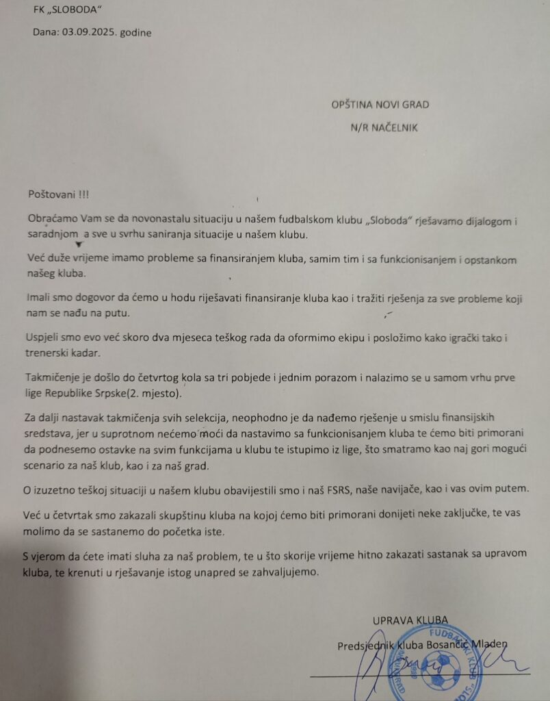 U srijedu, 10. septembra 2025. godine održaće se vanredna sjednica Skupštine FK “Sloboda MINOA” na kojoj će biti poznato da li će doći do promjena finansiranja od strane Opštinske uprave Novi Grad ili da li će klub napustiti Prvu ligu. U tom slučaju Upravni odbor će podnijeti ostavku, raspuštanje Skupštine, a klub će biti ugašen. Shodno tome igračima bi bio izdat prijem i raskid ugovora.