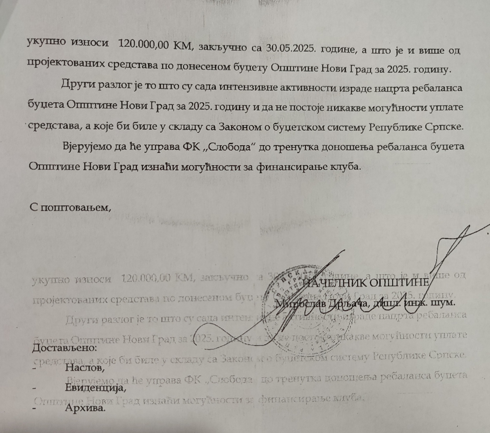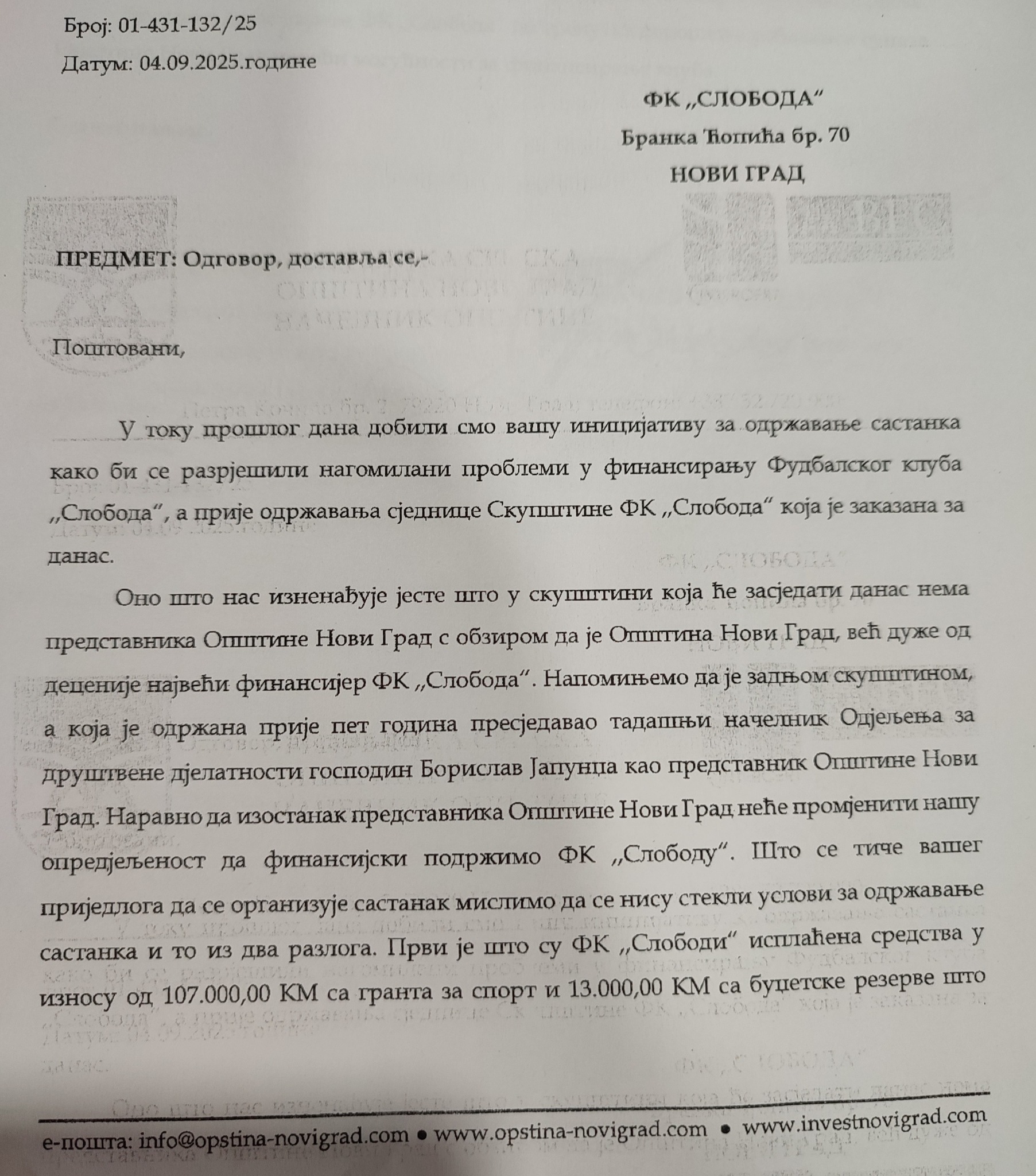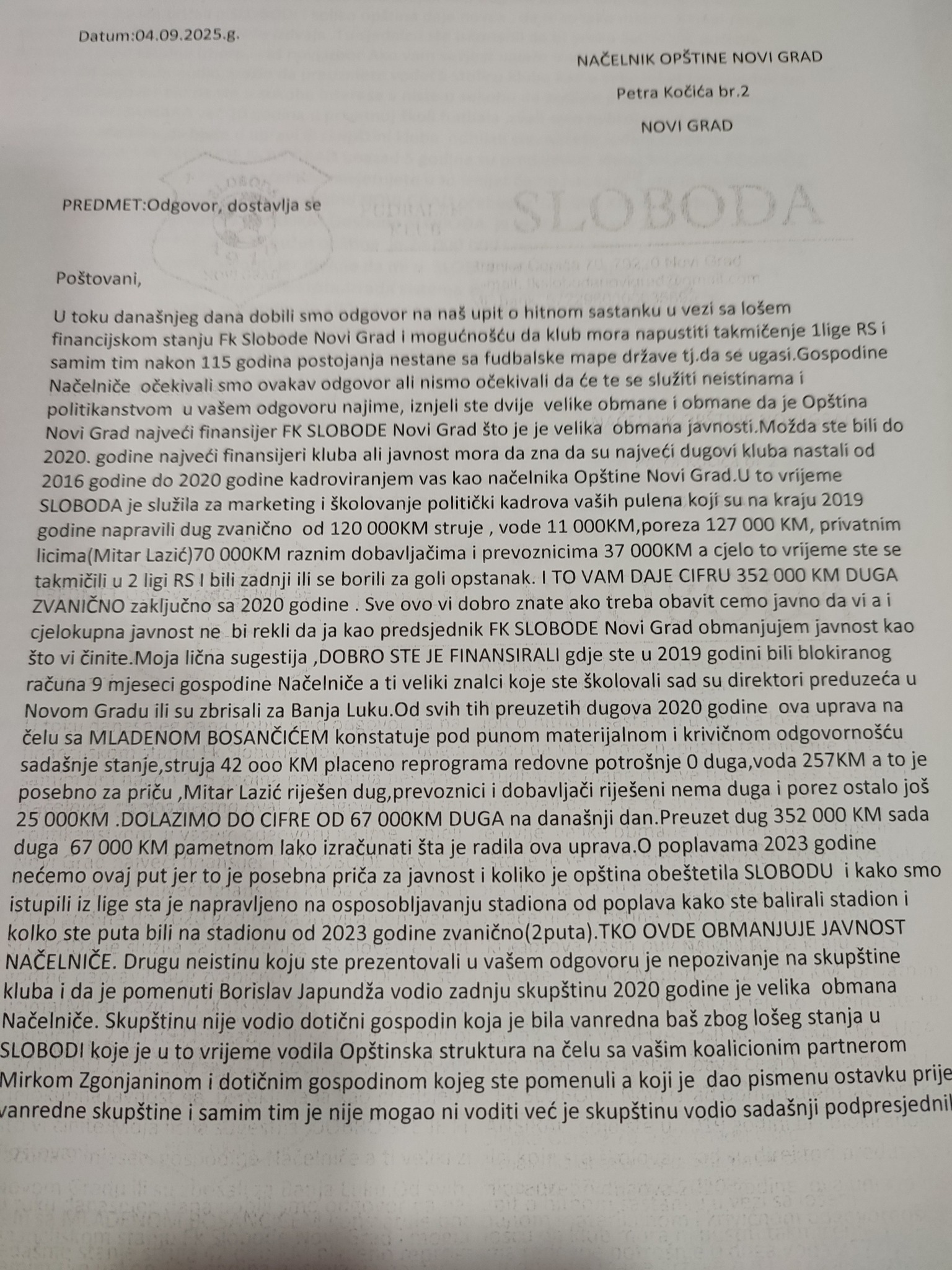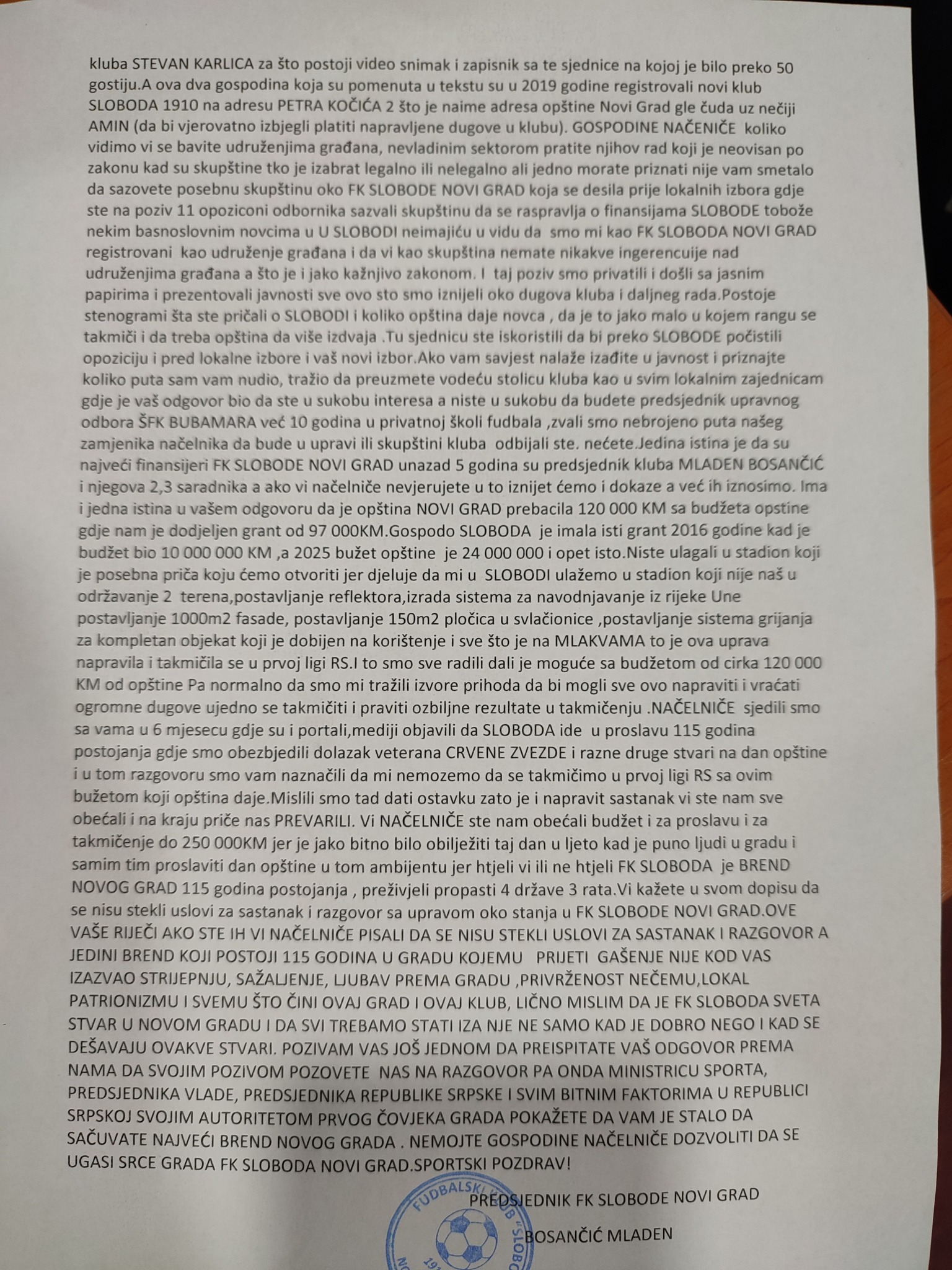 Pored toga objavljujemo pisane prepiske predsjednika kluba Mladena Bosančića i gradonačelnika Novog Grada Miroslava Drljače: