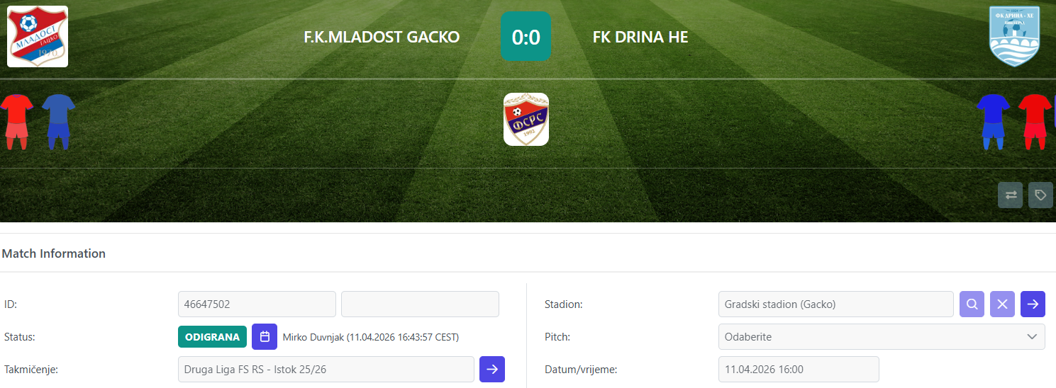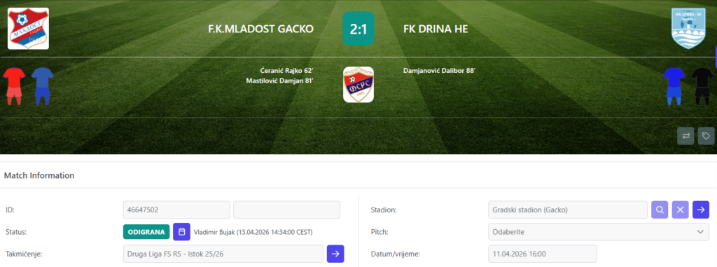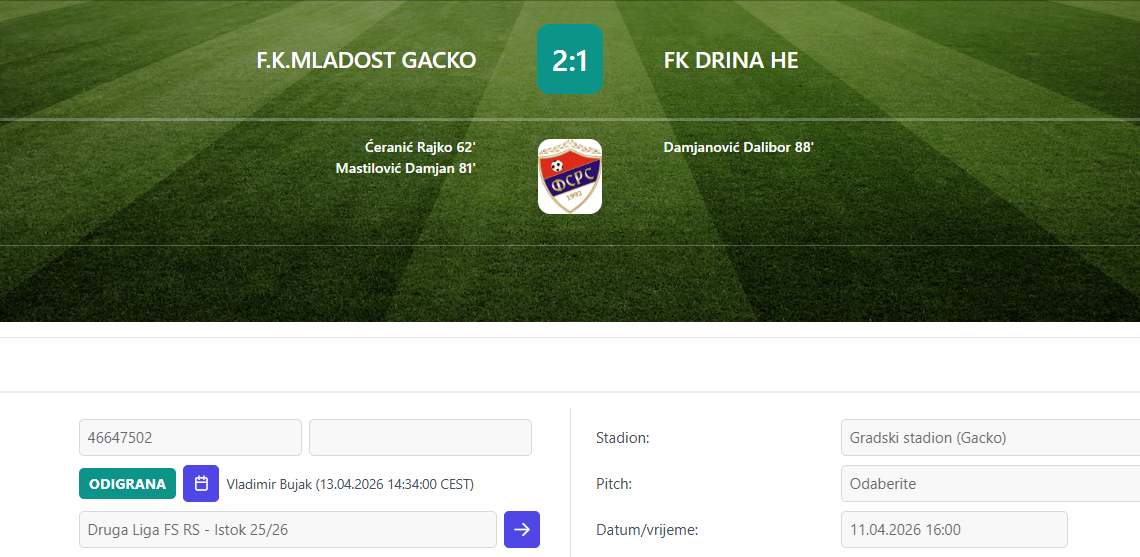 Greška je ispravljena, Mladost iz Gacka je pobijedila Drinu HE sa 2:1 i u Comet sistemu, što je prepravljeno danas u 14,34 časova. Inače, grešku je napravio delegat Mirko Duvnjak iz Rogatice, koji je utakmicu zaključio nakon prvog poluvremena pri rezultatu 0:0, o čemu je naš portal pisao: https://pravdabl.com/i-to-se-desava-domacin-pobijedio-a-u-kometu-zakljuceno-na-00/