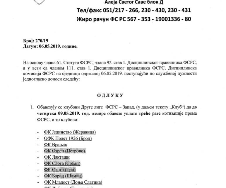 Naime, iz kancelarije FSRS na adresu čak 11 klubova stiglo je opozorenje pred suspenziju, da ukoliko se ne plati rata za kotizaciju (2.000 KM), do četvrtka 9. maja, klub neće moći nastupiti u nastavku sezone, odnosno, sve dok ne izmiri svoje obaveze.