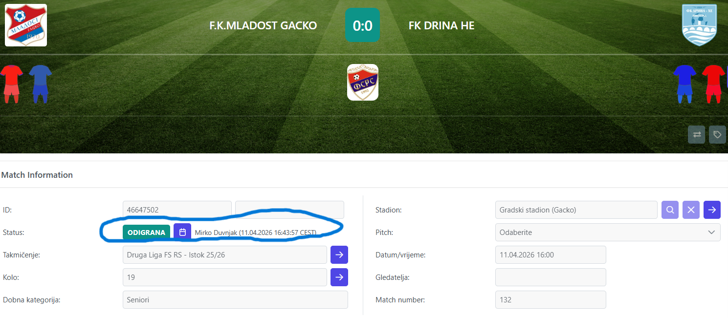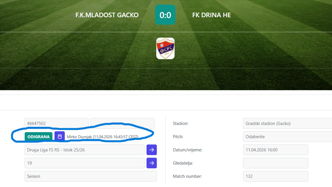 Gdje je greška? Naime, delegat utakmice Mirko Duvnjak iz Rogatice je utakmicu greškom zaključio u 43. minutu, pri rezultatu 0:0. Dobro je poznato da utakmicu zaključuje glavni sudija utakmice, a ovoga puta to je trebalo da uradi Vladimir Bujak iz Bijeljine, po završetku utakmice odnosno nakon što delegat utakmice popuni sve podatke u Comet sistemu.