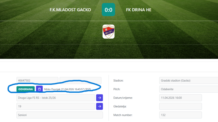 Greška je ispravljena, Mladost iz Gacka je pobijedila Drinu HE sa 2:1 i u Comet sistemu, što je prepravljeno danas u 14,34 časova. Inače, grešku …