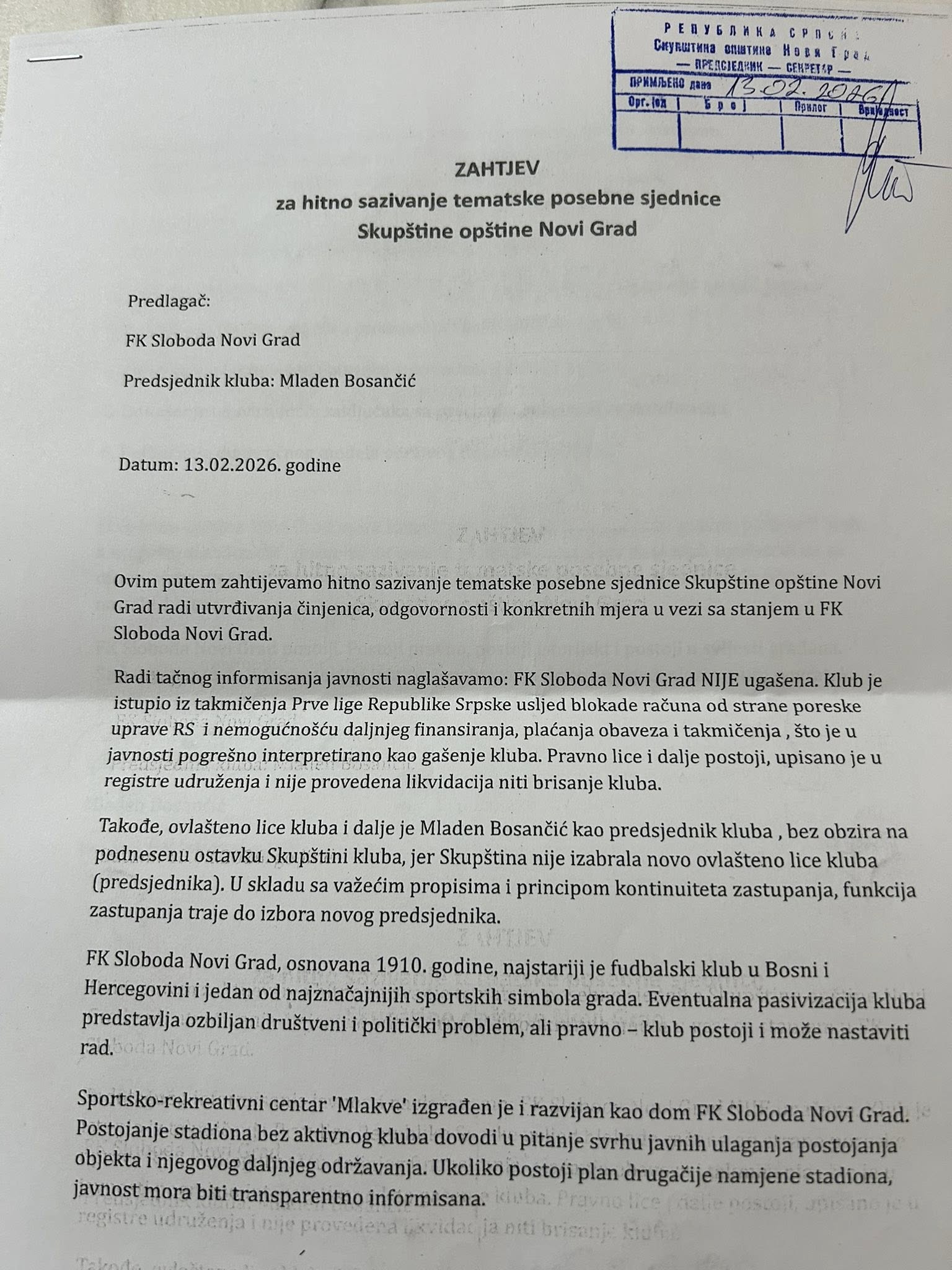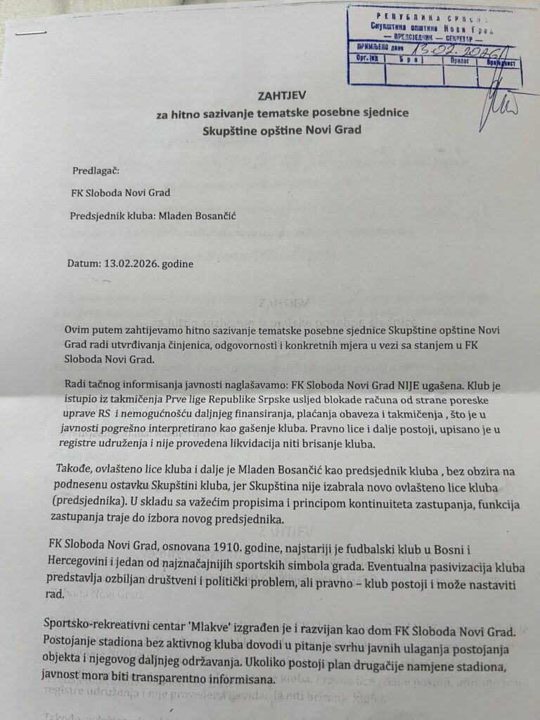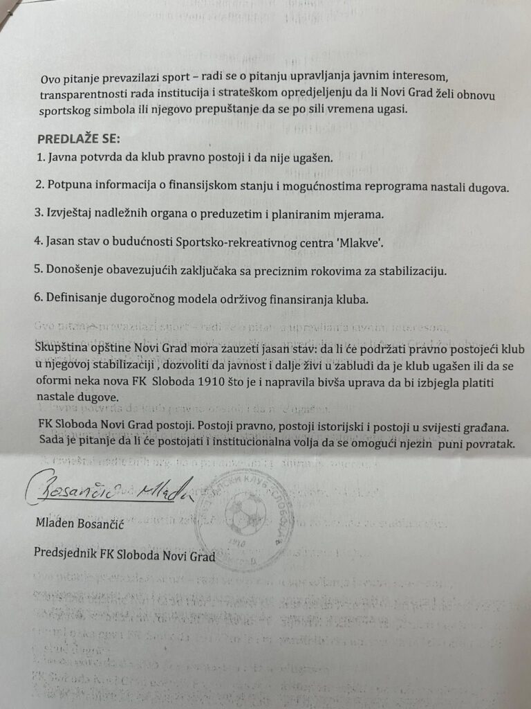Dugogodišnji igrač i funkcioner oglasio se na društvenim mrežama, gdje je napisao da je predsjedniku Skupštine opštine Novi Grad Mirku Šljokavici napisao inicijativu za hitno sazivanje posebne sjednice Skupštine opštine Novi Grad o “stanju i daljnjim radnjama” Slobode.