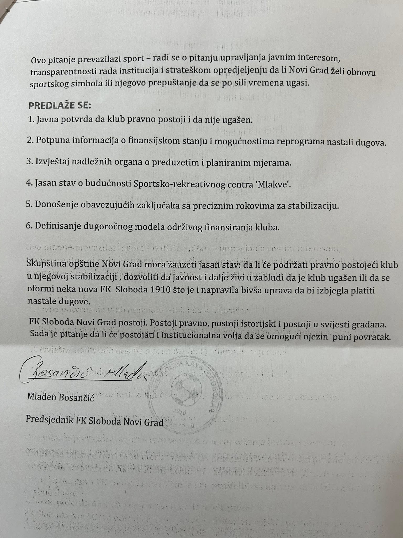 – Vrijeme je da se prestane sa obmanjivanjem javnosti i kuloarskim pričama da je klub ugašen. Klub nije ugašen – klub postoji. Ako danas ne igra i ne takmiči se, to nije zato što ne može, nego zato što mu je onemogućeno odlukama onih koji su imali moć da pomognu. Građani imaju pravo da znaju ko je dozvolio da simbol grada dođe u ovu situaciju i zašto obećana podrška nikad nije realizovana. Ovo više nije sportska tema. Sloboda nije ugašena ona postoji i ima pravo na riješenje, podršku i budućnost. Vrijeme je da se o sudbini najstarijeg sportskog simbola grada razgovara javno, odgovorno i u institucijama grada koji donose odlučujuće i obavezujuće odluke za ovaj grad – napisao je Bosančić.